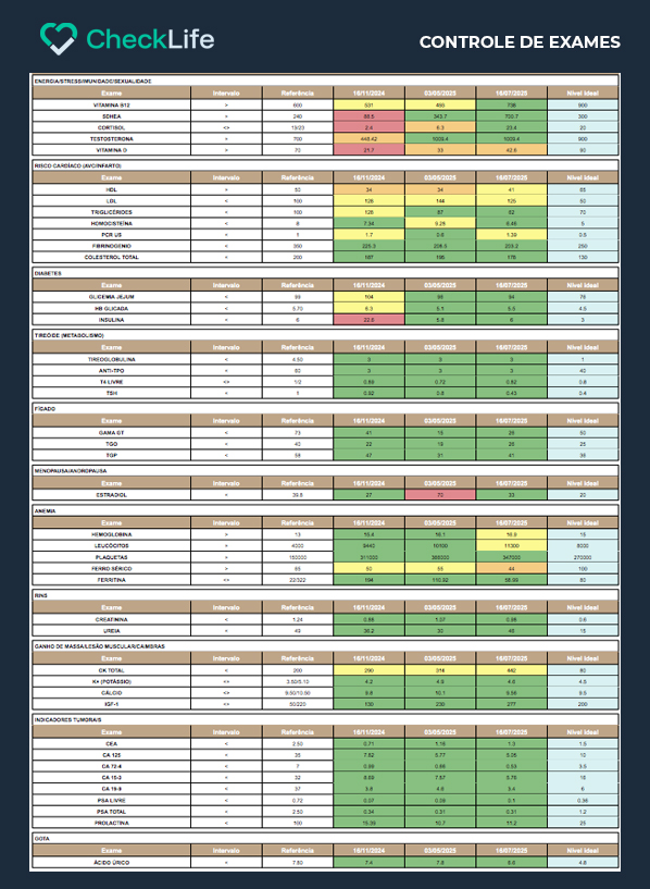 Um acompanhamento constante e integral das principais áreas de saúde do organismo com foco em risco cardíaco, energia, diabetes, emagrecimento, anemia, rins, câncer e outros.